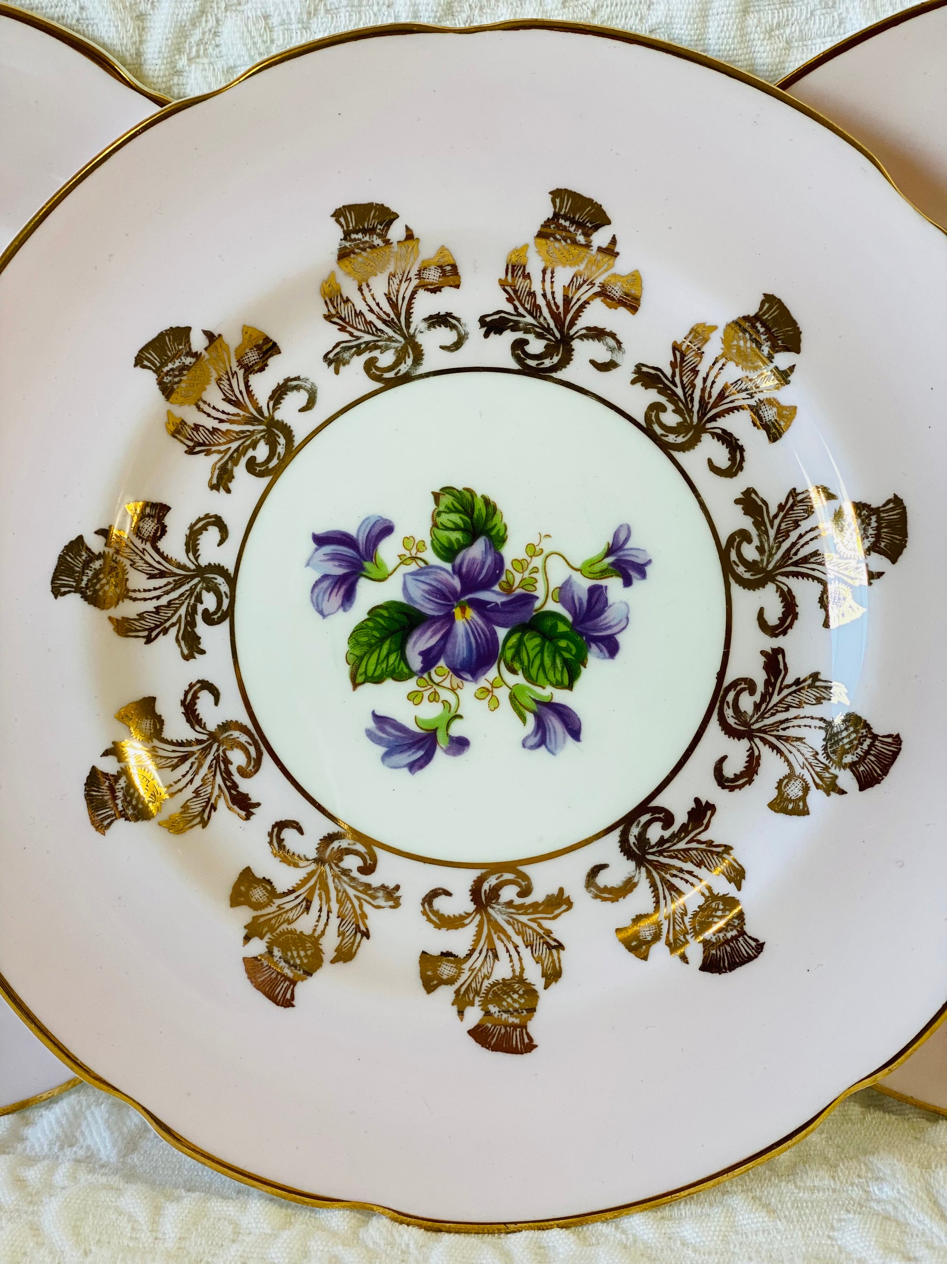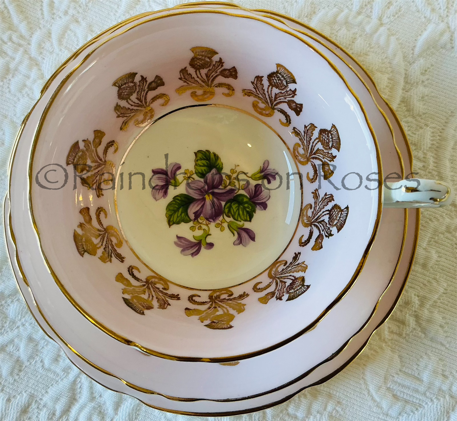 Paragon Pink Trios with Purple Violets. Pretty gold detailing